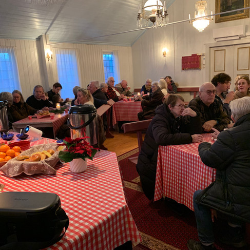 Efteråt blev alla inbjudna till kapellet. Folk satt runt borden och njöt av glögg, saffransbullar